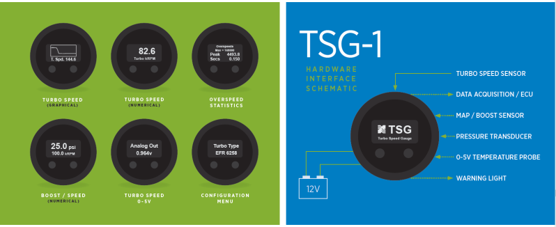 The TSG-1 analog input can capture and display data from auxiliary sensors such as MAP/Boost sensor, oil or fuel pressure and more. The TSG-1 generates a 12-bit 0-5 volt analog turbo speed signal that can be connected to an engine control system or datalogger. The TSG-1 also generates a warning output signal during overspeed events that can illuminate a warning light, trigger a relay or other device.